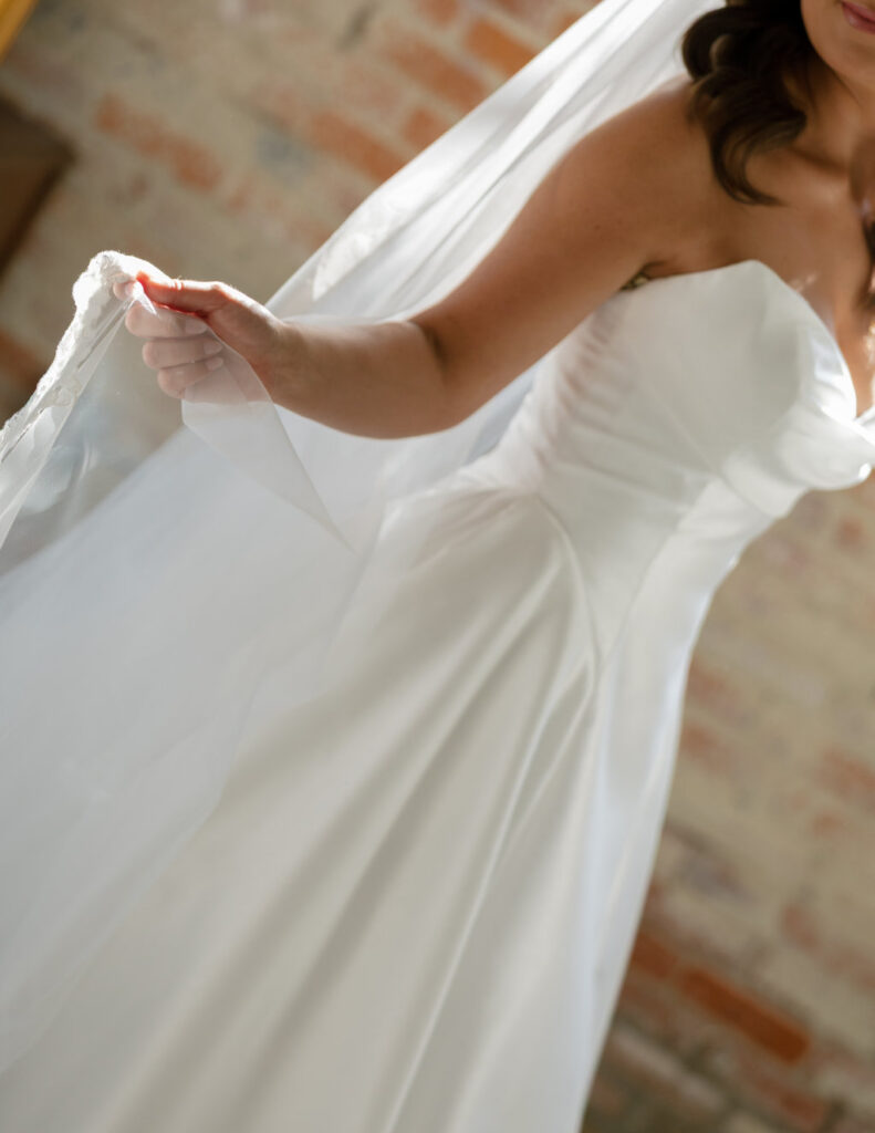 They spent their morning at The Ellis in Italian Village, a space that fit their style perfectly. Clean, modern, and warm, it set the tone for a day built on timeless choices. The guys in tuxes, the fall florals that pulled in subtle texture without overwhelming the room, and Lauren’s dress—classic and stunning in the most effortless way.