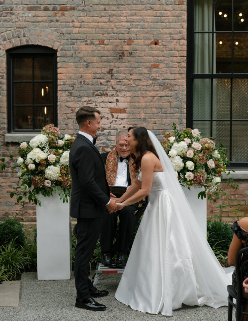 Right before the ceremony at The Ellis, a small sprinkle of rain came through—just enough for everyone to pause, laugh, and call it good luck. And as quickly as it arrived, it disappeared. The payoff came later in the form of a perfect golden hour. The light softened, filtered through the buildings, and added a subtle warmth to everything. It was one of those moments you can’t plan for but always hope for.